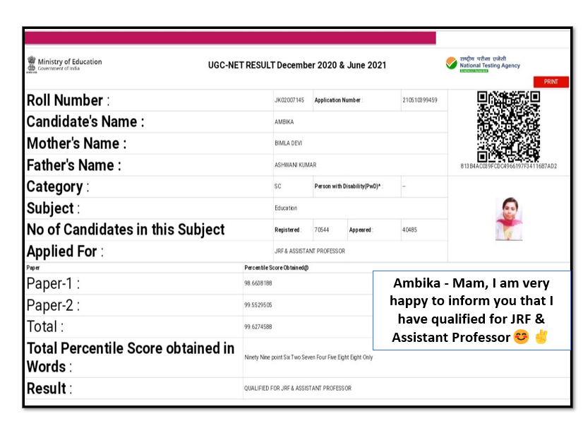 Ambika- Thank you so much, mam, I am so so happy to inform you that I cleraed Jrf with your support and guidance. Thank you, mam.😊✌️